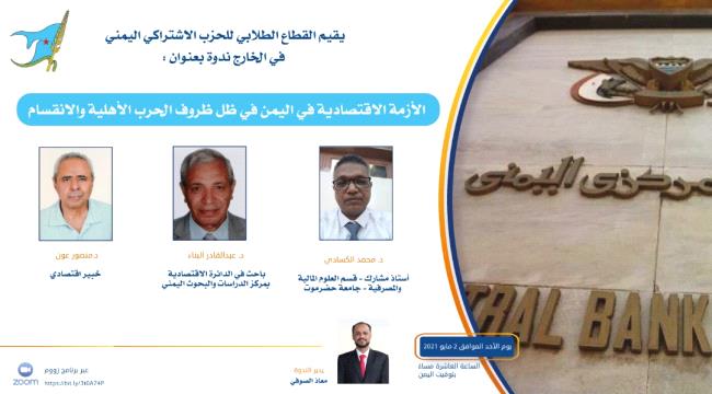 نظم القطاع الطلابي للحزب الاشتراكي اليمني في الخارج، الاثنين، ندوة بعنوان "الأزمة الاقتصادية في اليمن في ظل ظروف الحرب الأهلية والانقسام".