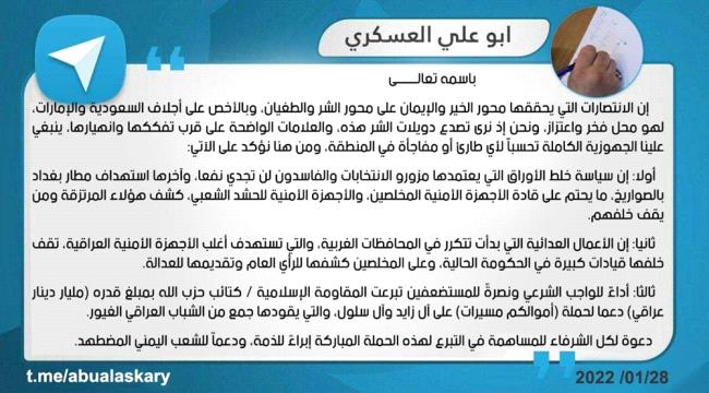 وأضاف العسكري "تبرعت كتائب حزب الله لحملة (اموالكم مسيرات) لدعم الحوثيين في اليمن لضرب الامارات والسعودية".